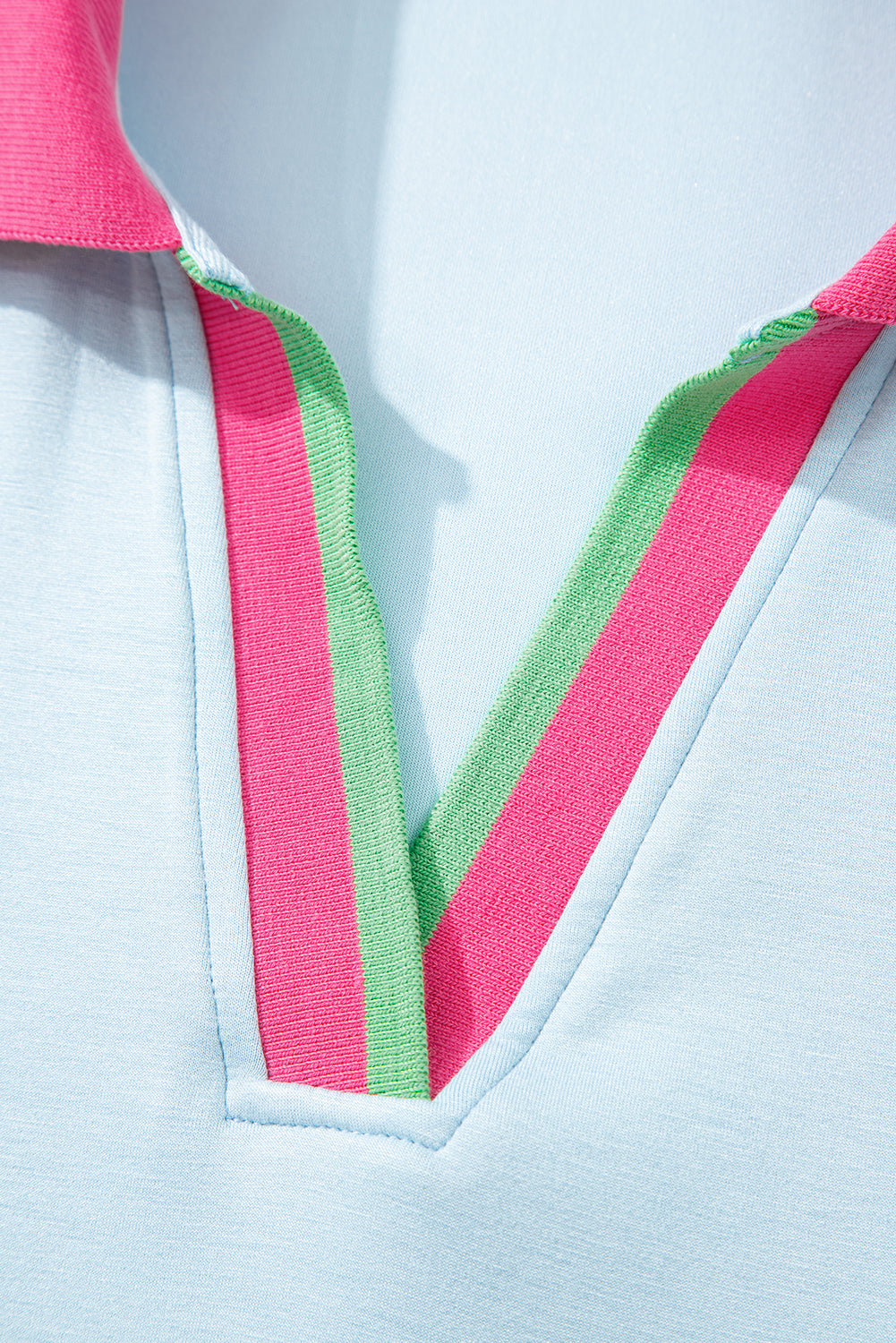 Beau Blue Pop of Color Collared V Neck Ruffle Sleeve Blouse