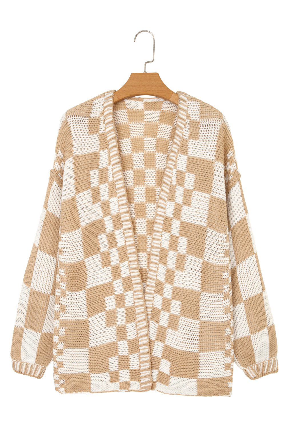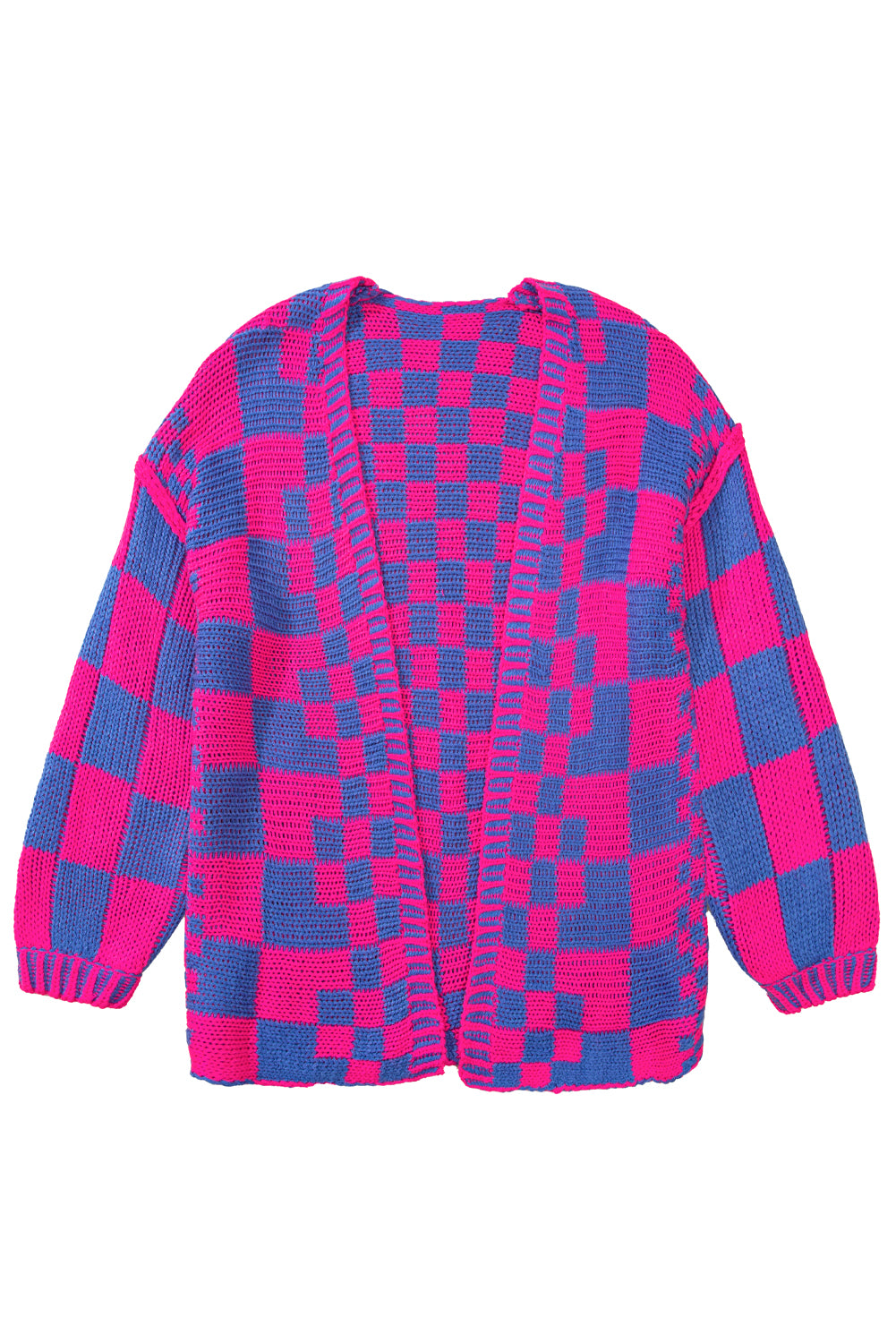 Dark Grey Colorblock Checked Loose Fit Open Front Knitted Cardigan