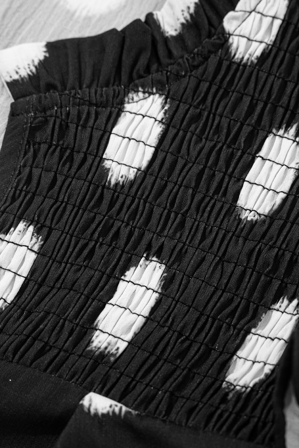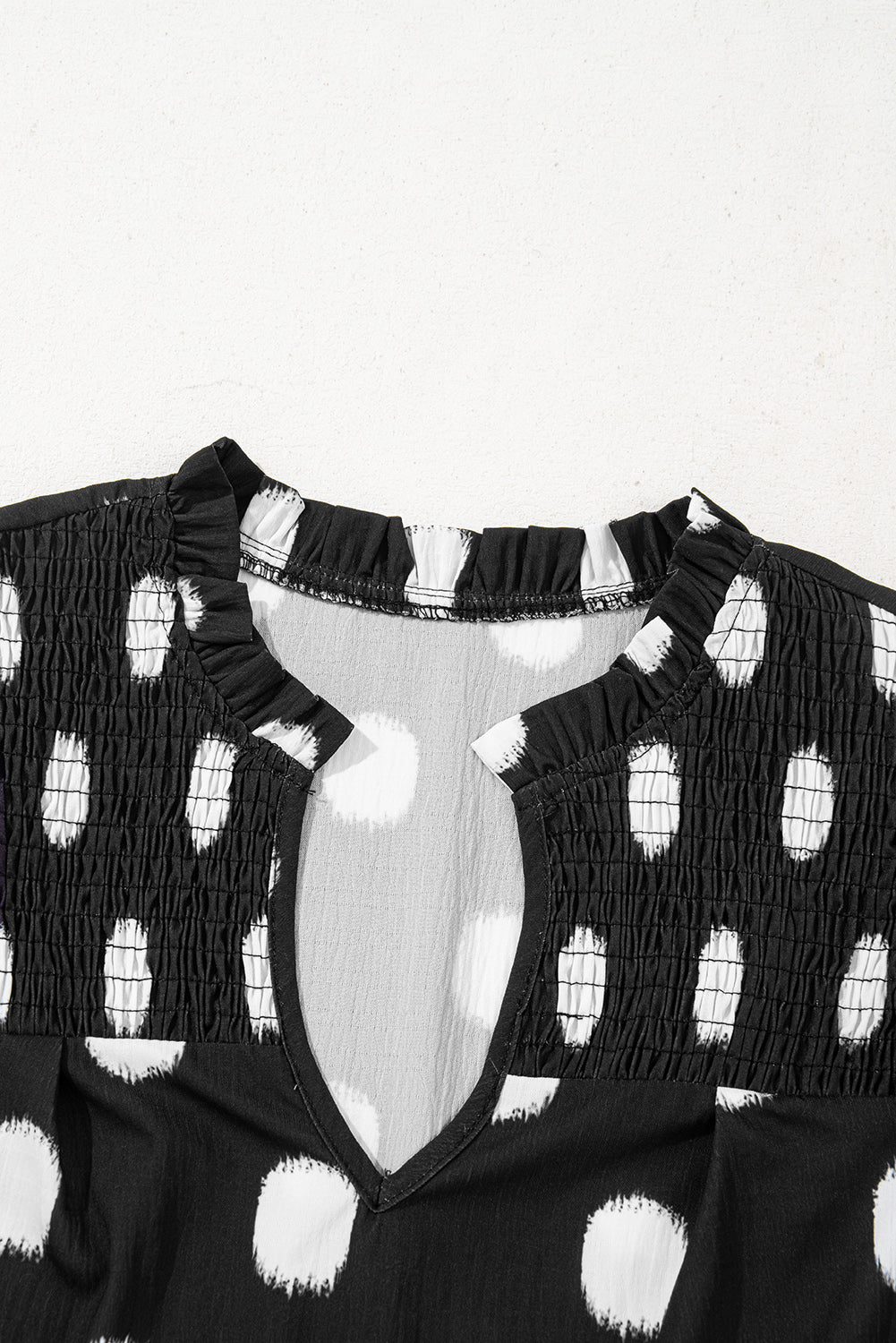- Ruffles on shoulder, shirred yoke and balloon sleeve.